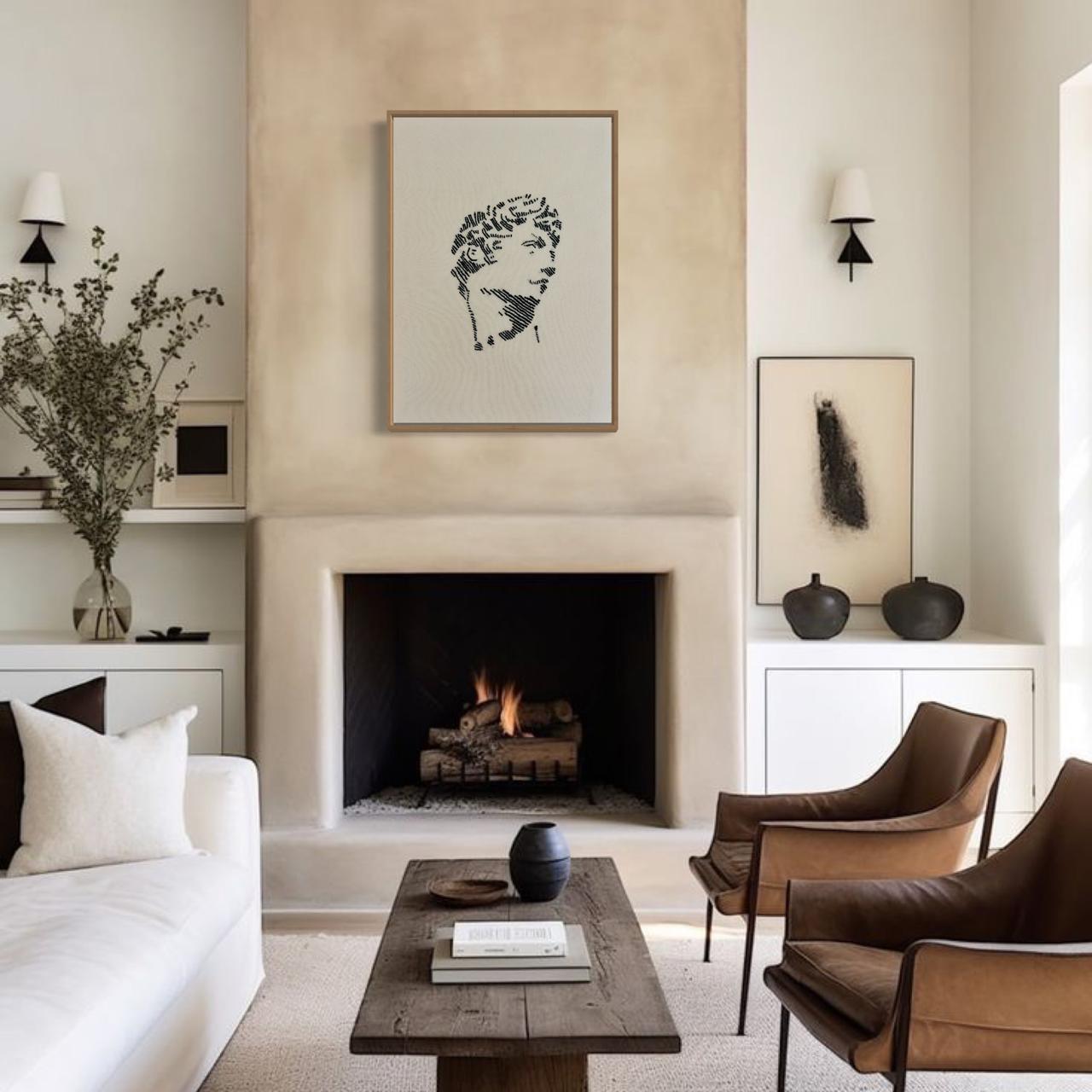 Este cuadro de decoración bordado a mano representa una silueta inspirada en una escultura griega, con detalles en hilos negros que resaltan su elegancia clásica y atemporal. Su diseño minimalista en tonos monocromáticos aporta sofisticación a cualquier ambiente.