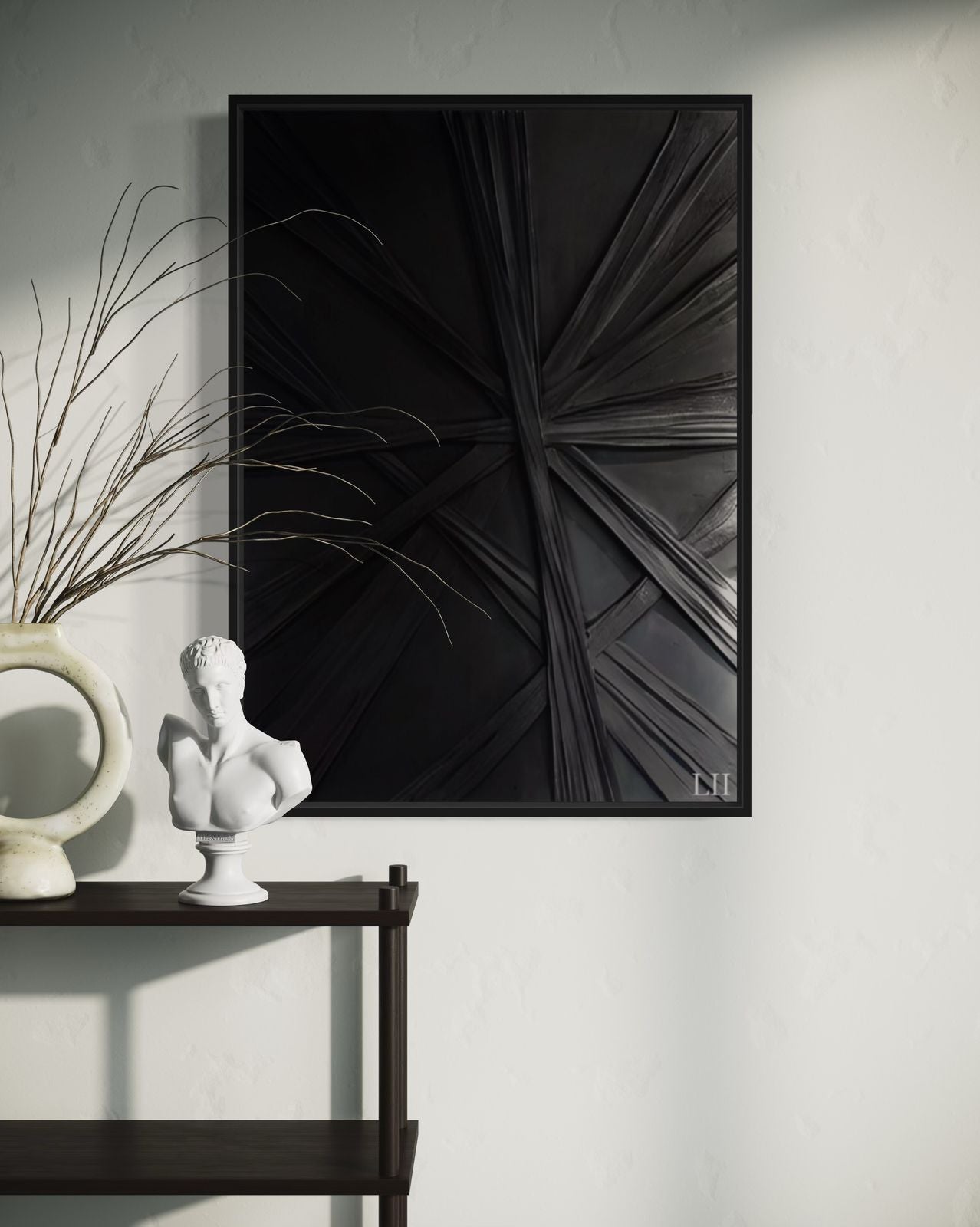 Este cuadro decorativo presenta tiras de tela negras entrecruzadas sobre un fondo oscuro, creando una composición abstracta y sofisticada que juega con texturas y profundidad visual. Su diseño monocromático en negro le otorga un estilo moderno y elegante, ideal para complementar diferentes tipos de ambientes.