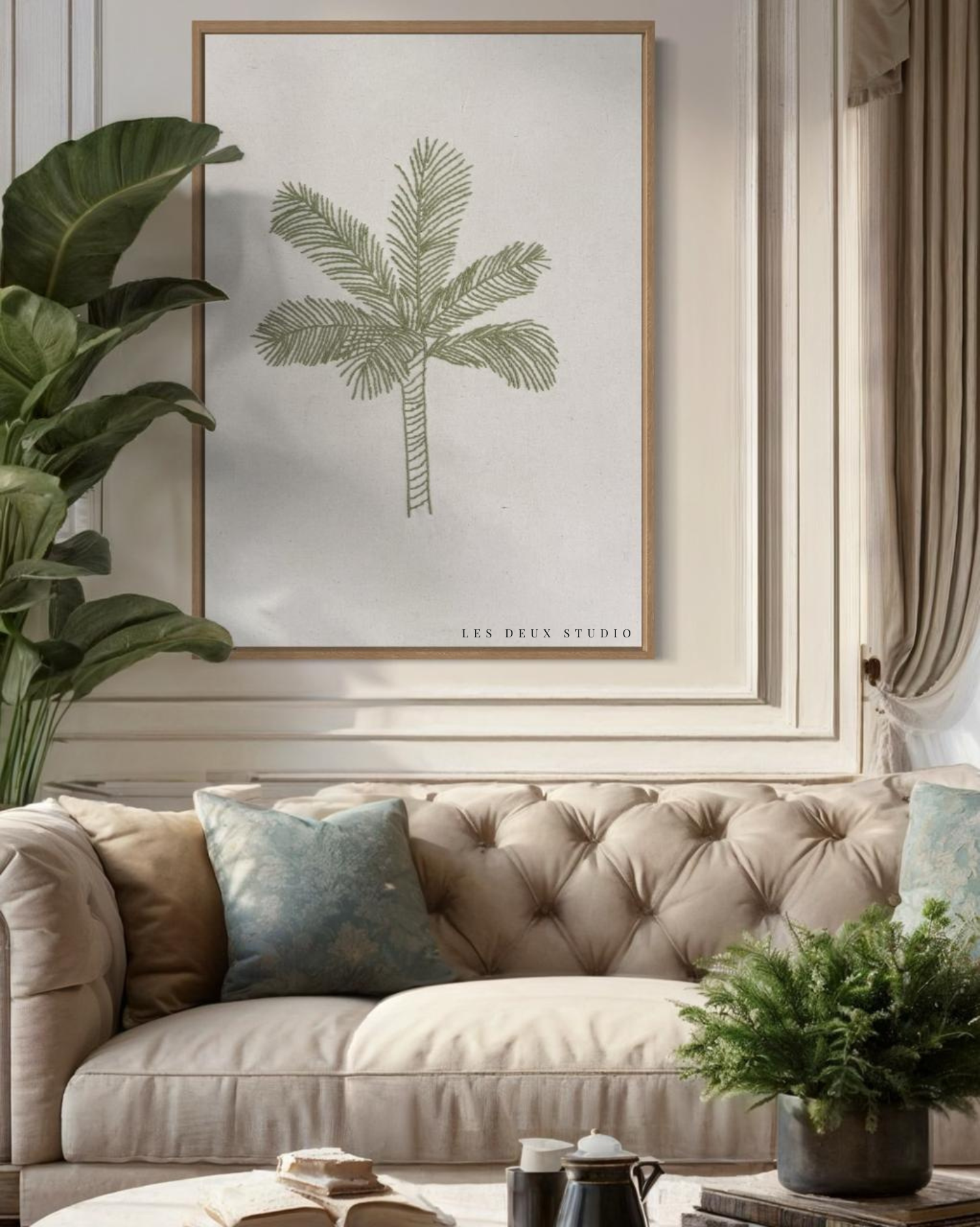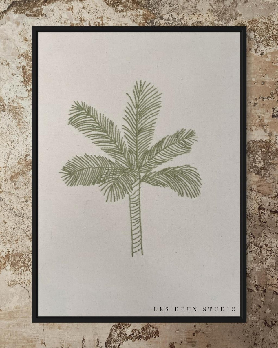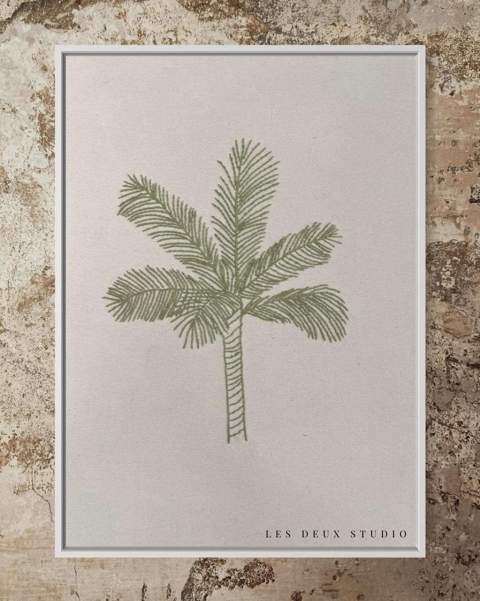 Este cuadro de decoración bordado a mano muestra una palmera en un delicado tono verde, ideal para dar un toque natural y fresco a cualquier espacio. Su diseño artesanal lo convierte en un complemento perfecto para ambientes que buscan una conexión con la naturaleza.
