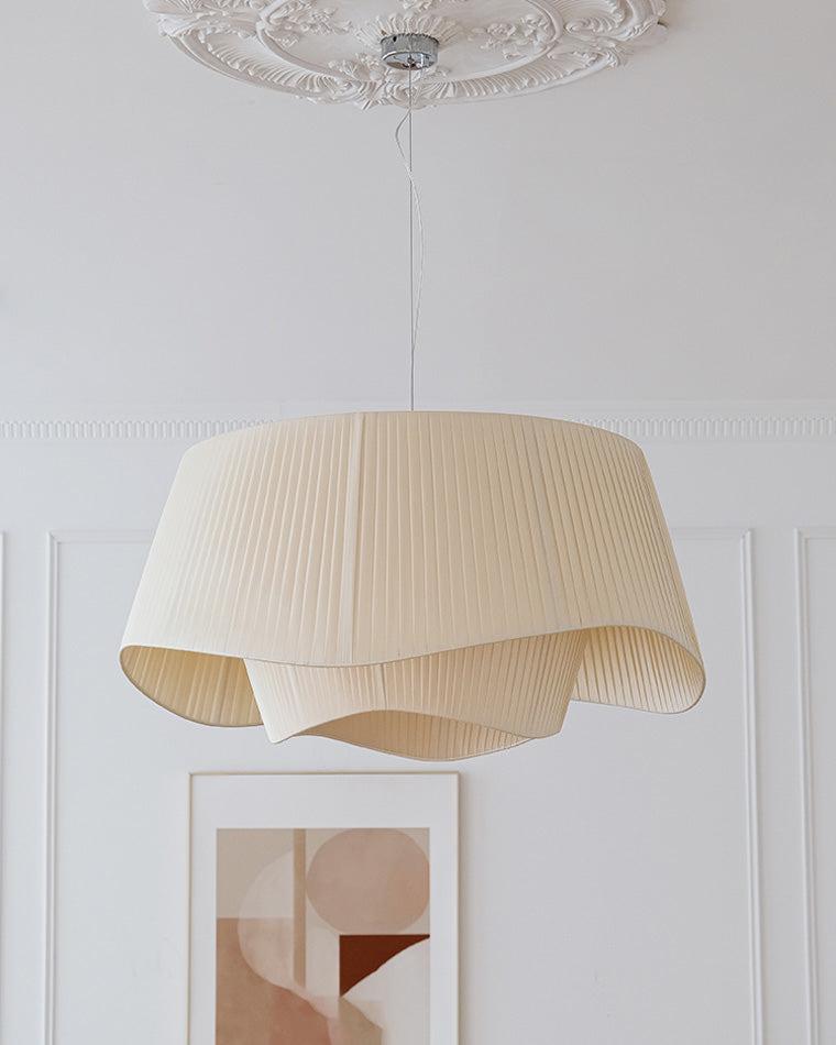 Esta lámpara colgante artesanal presenta un diseño ondulado y fluido, en tonos suaves que añaden una sutil elegancia y luminosidad a cualquier espacio. La luz se filtra suavemente a través de su estructura plisada, creando un efecto visual delicado y acogedor.