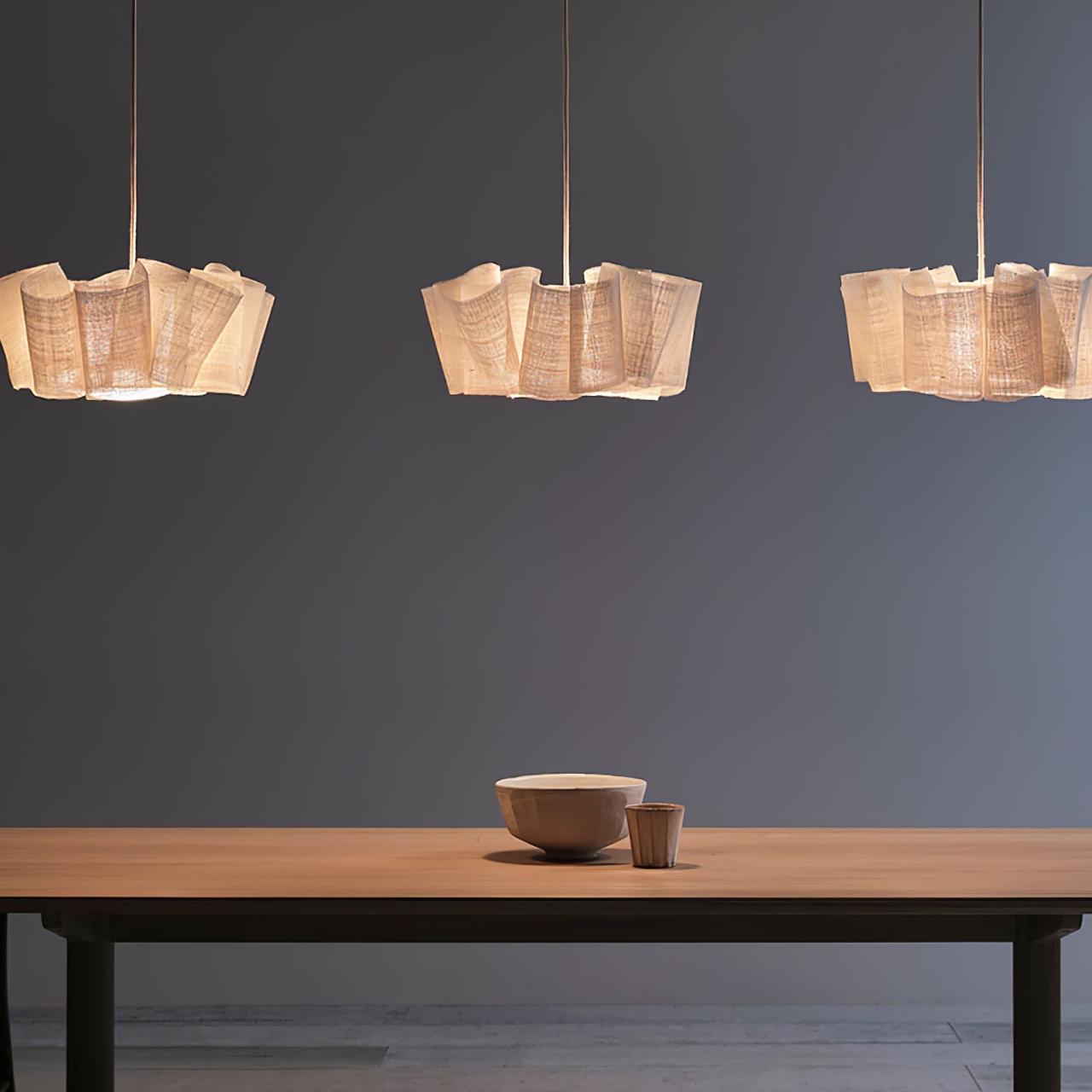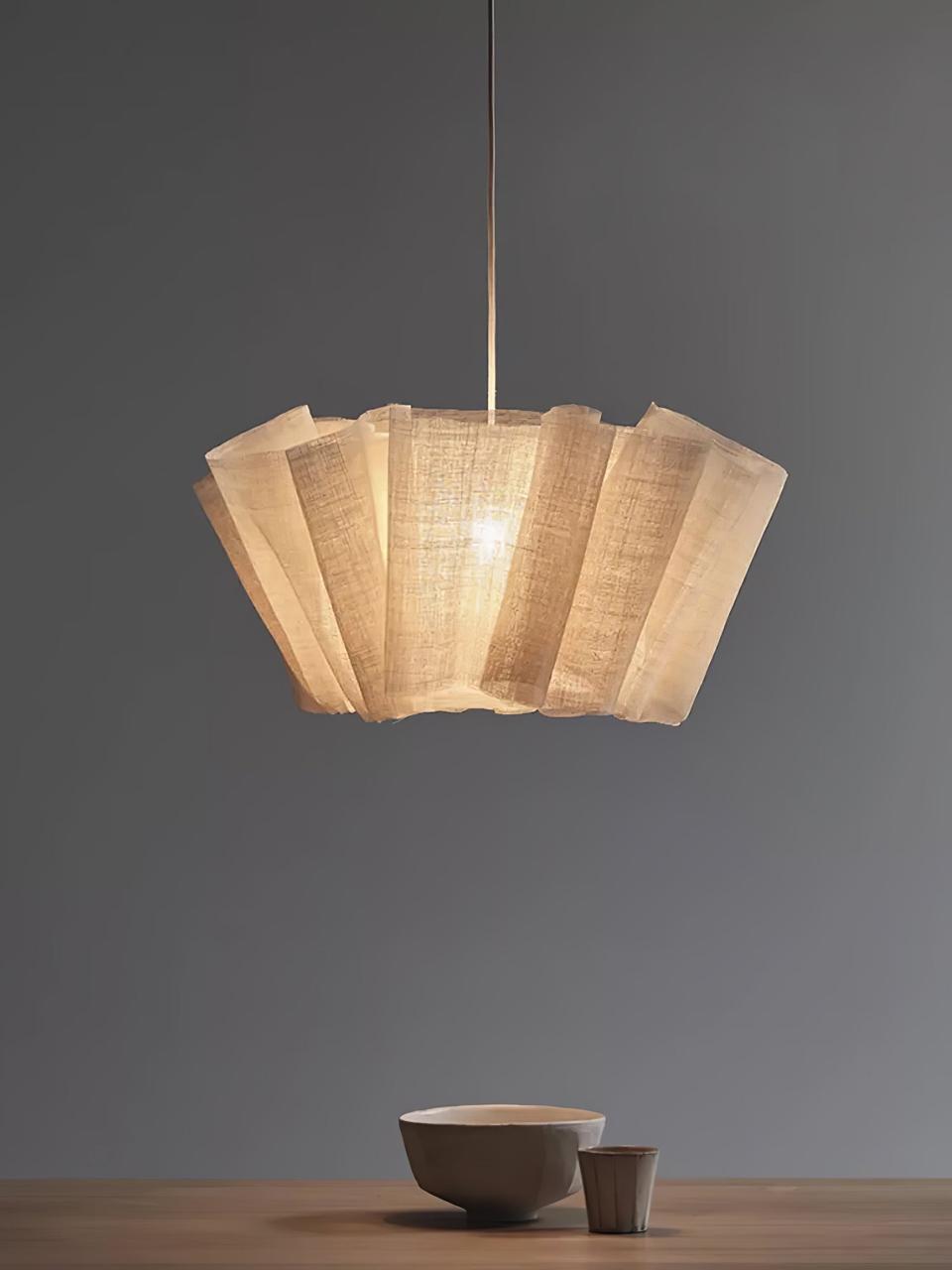 Esta lámpara artesanal presenta un diseño plisado generando una estructura suave y ondulada que rodea la luz, creando un efecto de iluminación cálido y difuso.