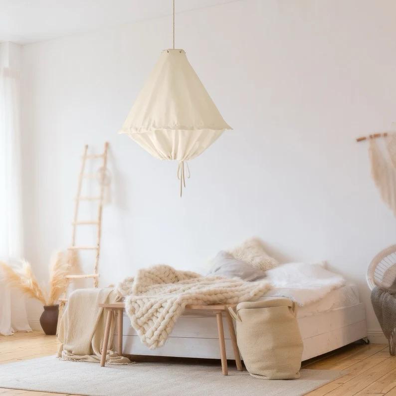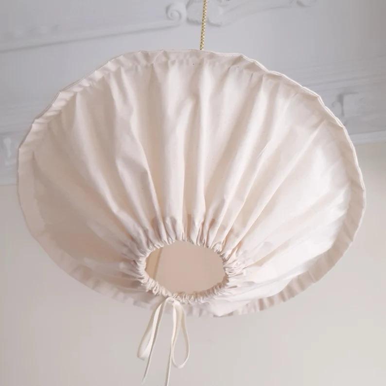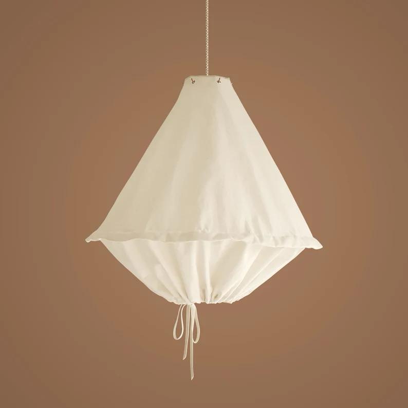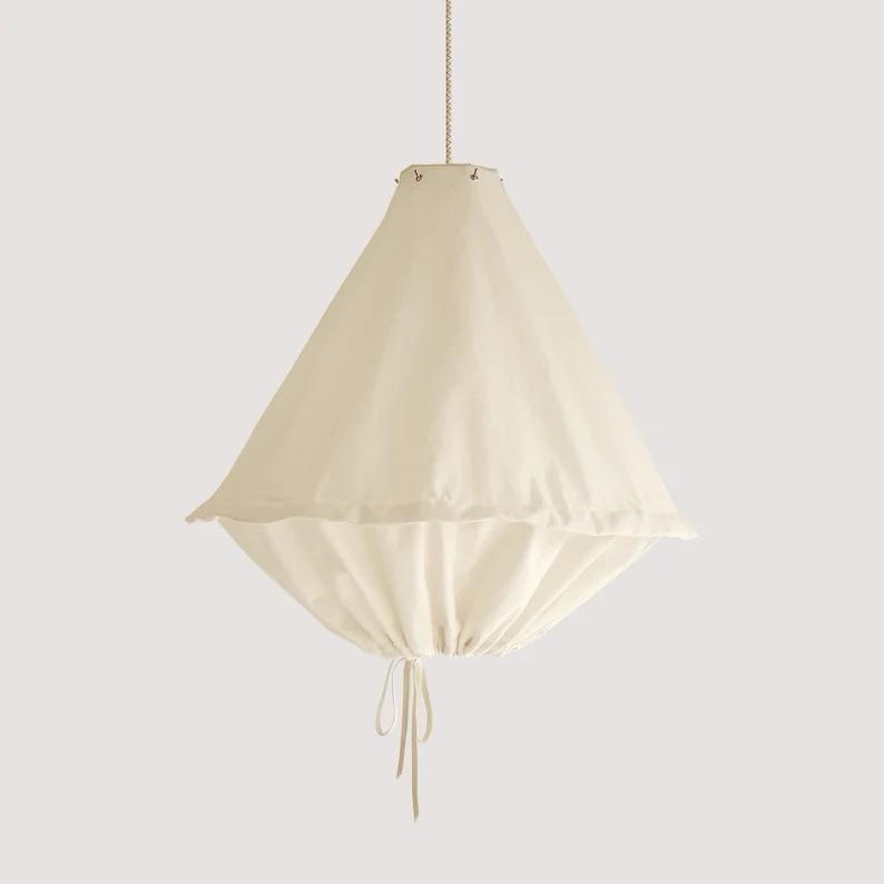 Esta lámpara colgante hecha a mano tiene una estructura de tela en tonos crudo, con un diseño suavemente plisado que termina en un nudo ajustable en la parte inferior, creando una apariencia elegante y fluida.
