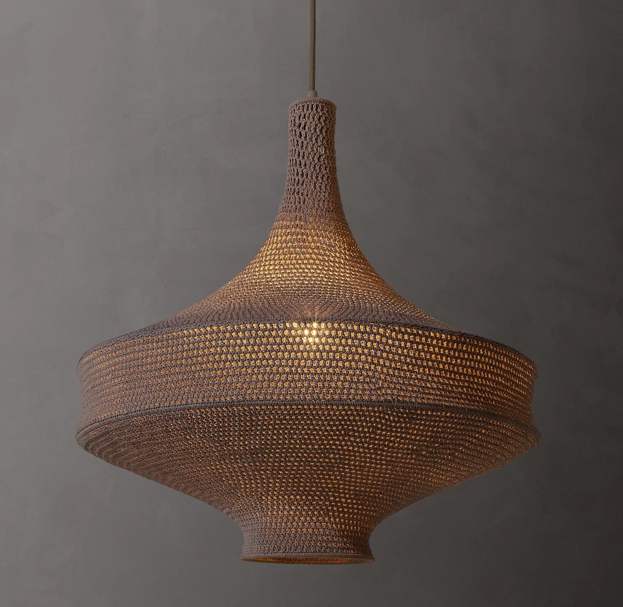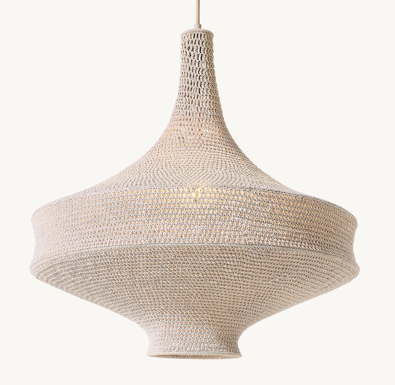Esta lámpara colgante artesanal presenta una estructura en forma de capullo, tejida con un patrón de malla, que permite una sutil difusión de luz, generando un ambiente cálido y acogedor.