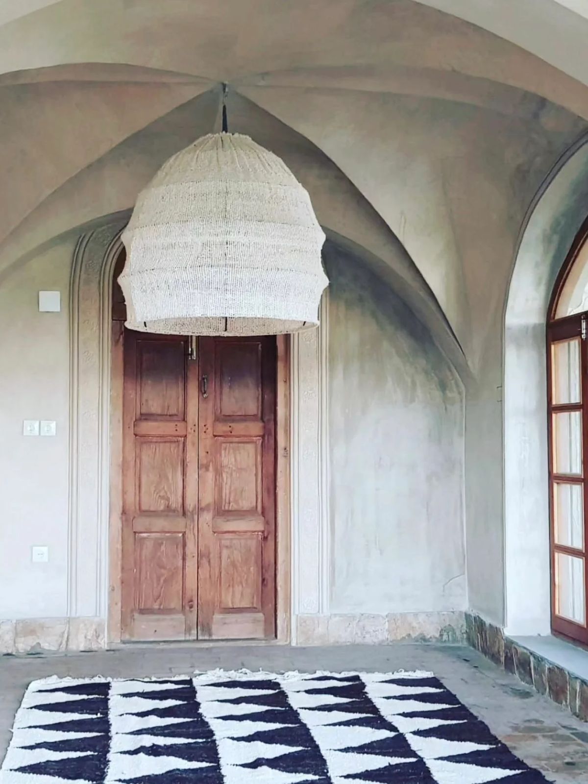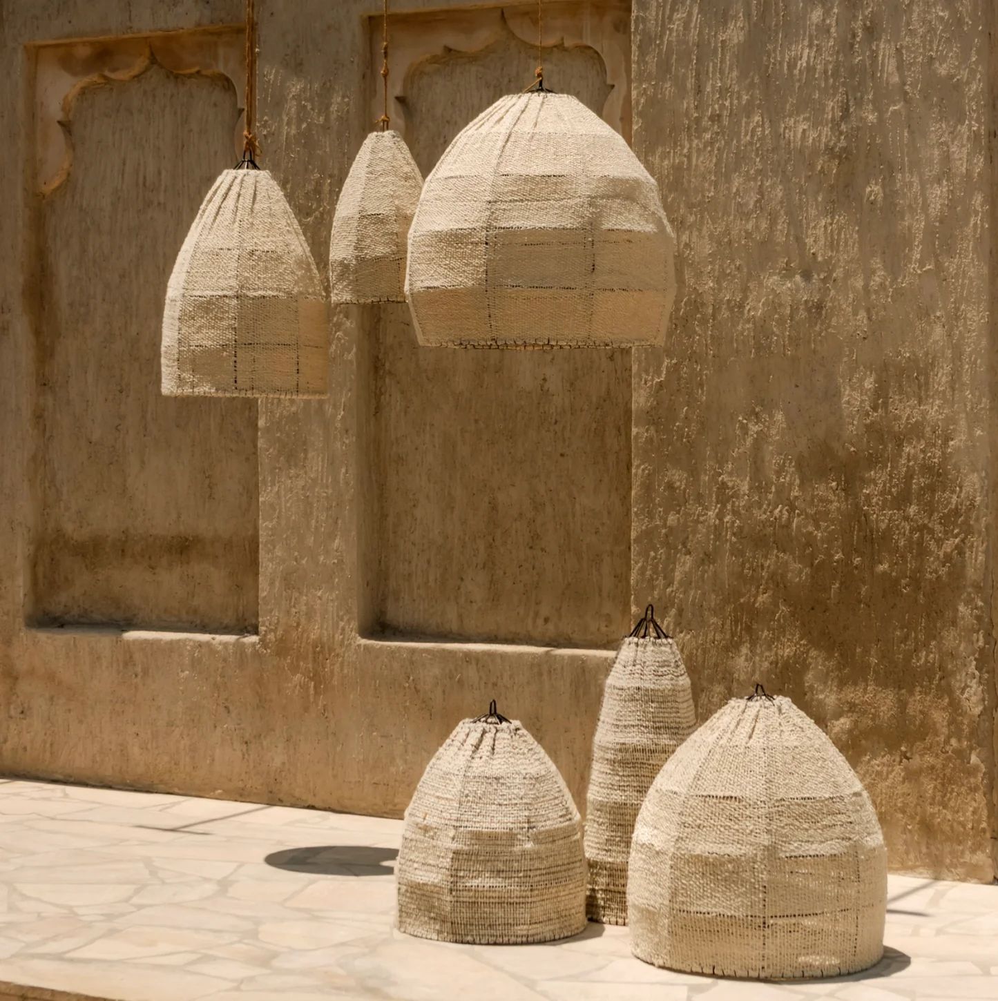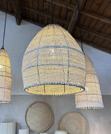 Esta lámpara colgante artesanal tiene una forma semicircular amplia, confeccionada en tela con un acabado rústico y cálido. Su diseño y textura brindan una iluminación suave y acogedora, ideal para crear ambientes relajados y naturales.