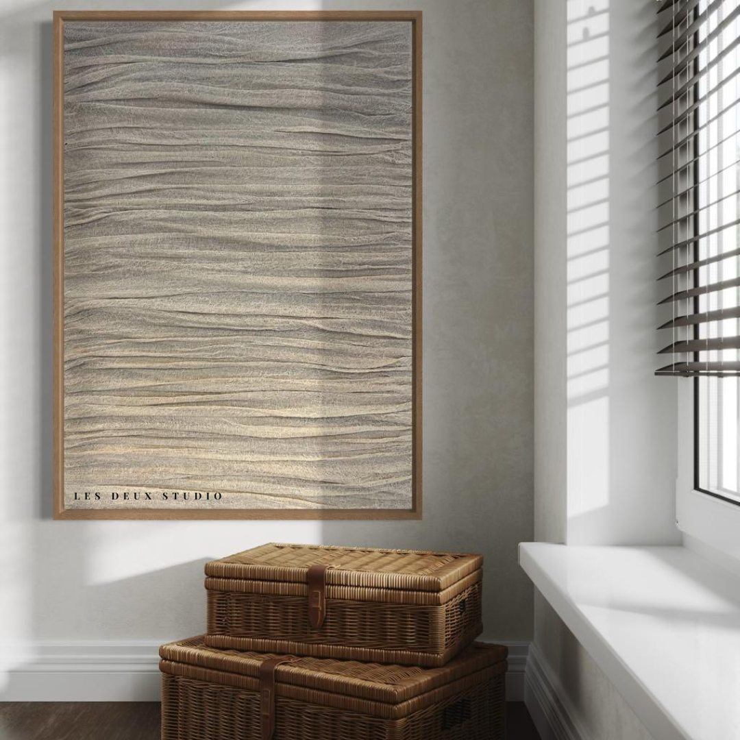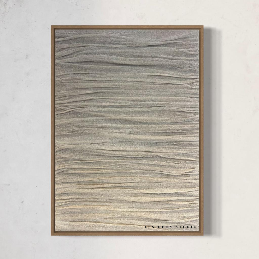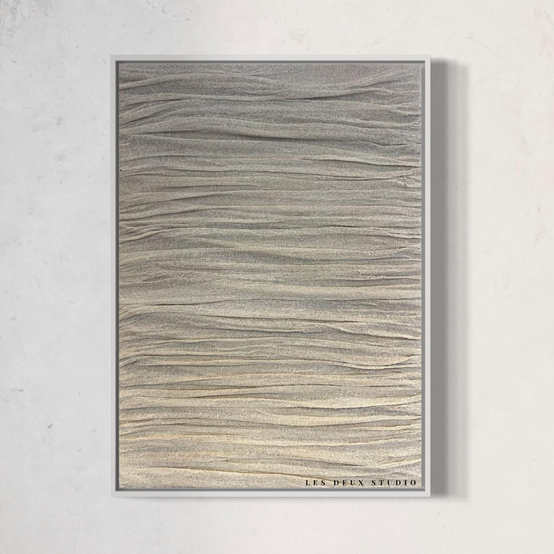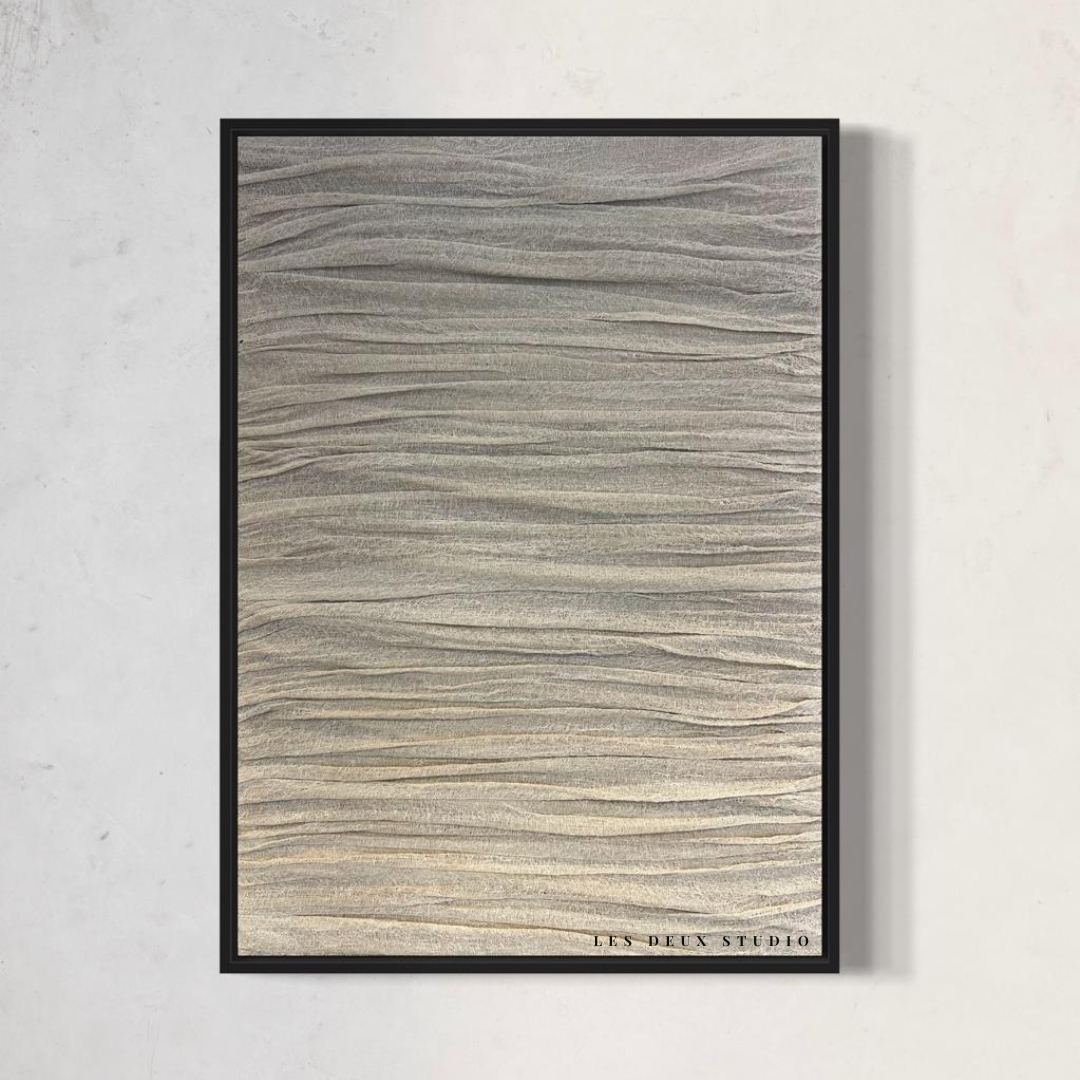 Cuadro de decoración confeccionado a mano que evoca las suaves ondulaciones del agua o la arena, mediante pliegues textiles en tonos beige, gris perla y marfil. Su textura orgánica y relieve sutil generan una composición abstracta y elegante.