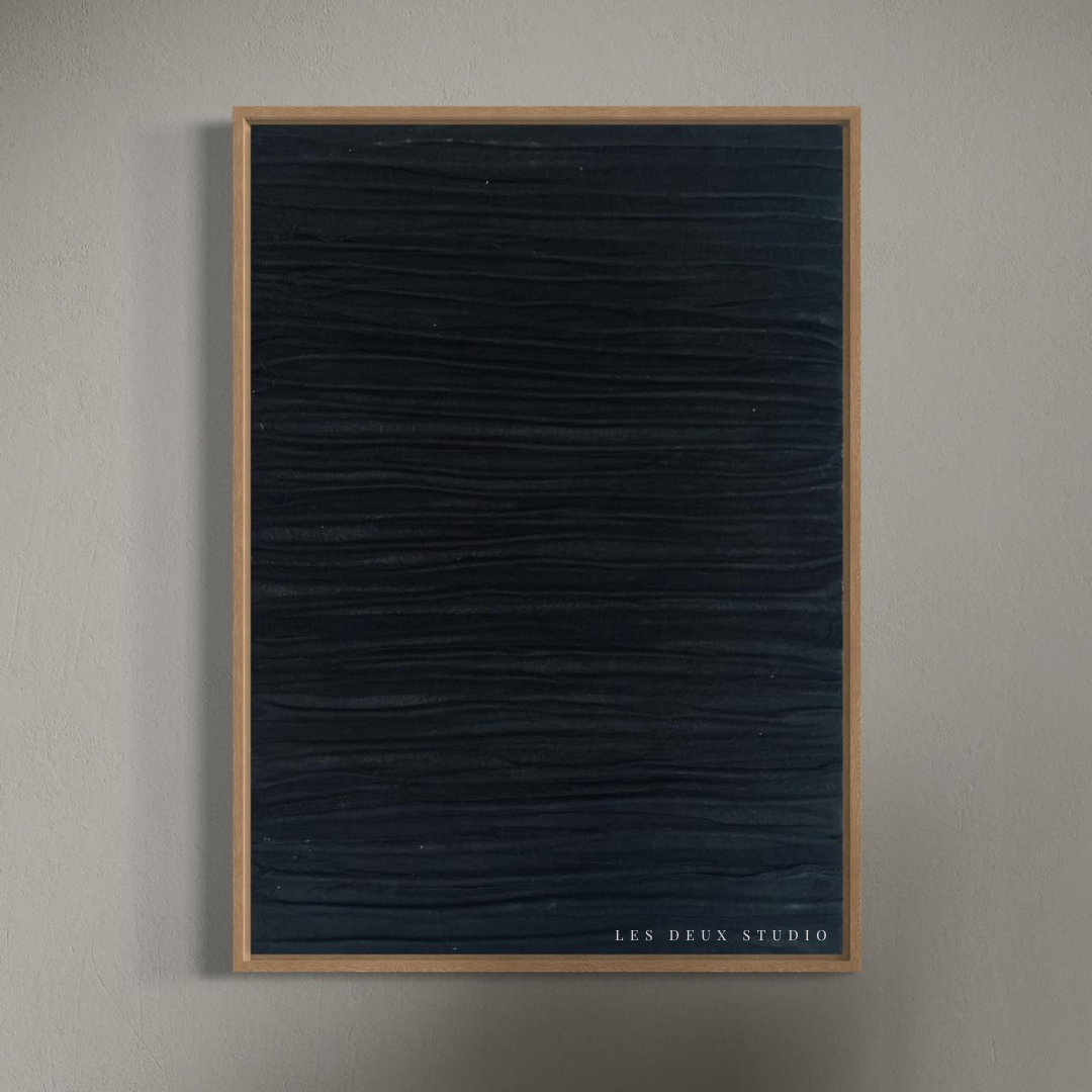 Cuadro confeccionado a mano que reproduce pliegues ondulantes sobre una superficie textil de tono negro profundo, generando un efecto visual que evoca la quietud del océano en la noche. Su textura sutil añade profundidad y sofisticación al ambiente.