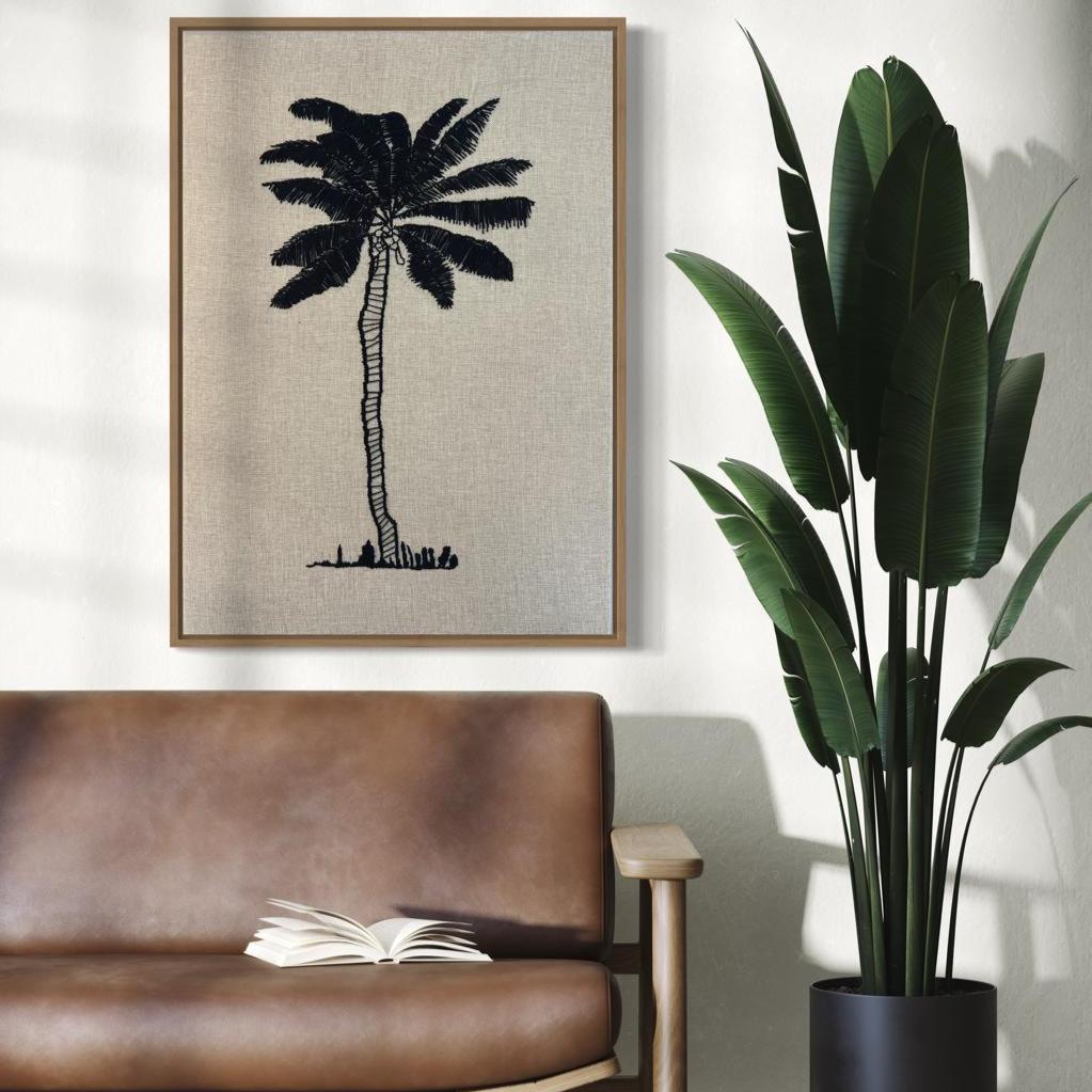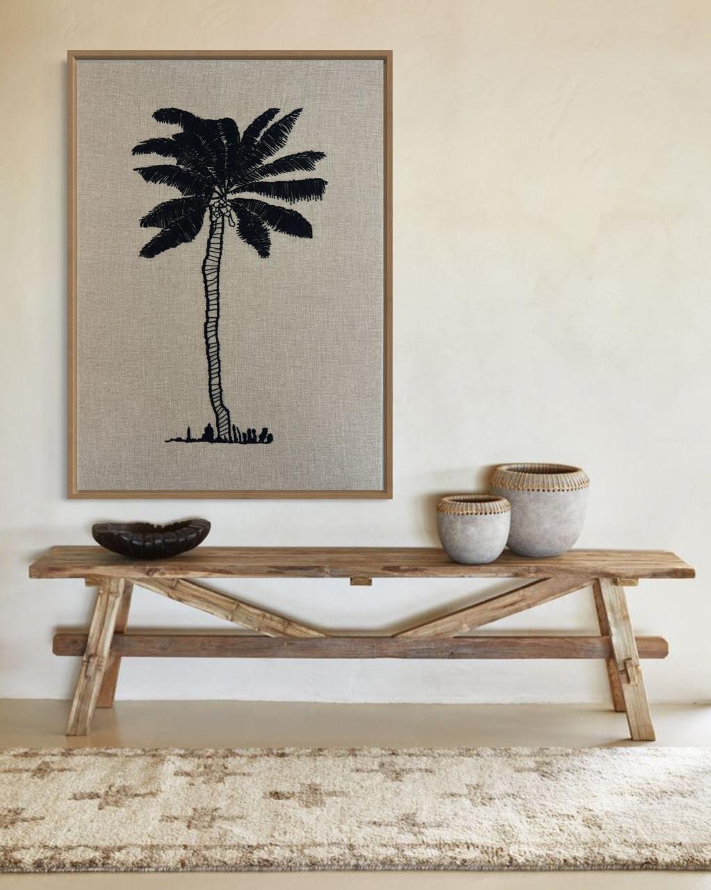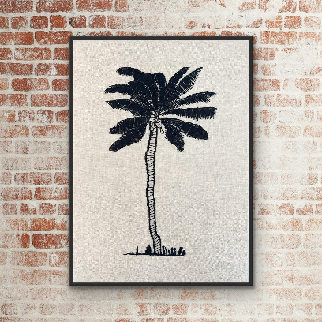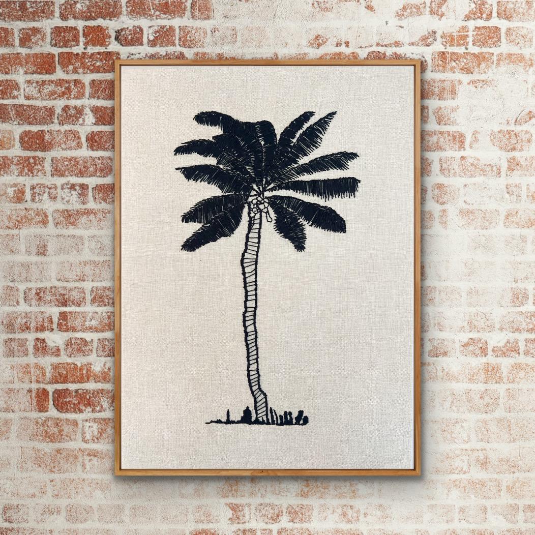 Este cuadro de decoración bordado a mano muestra una palmera en tonos negros sobre un fondo crudo, ideal para crear un ambiente sofisticado y relajado.
