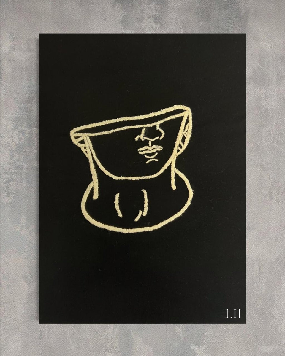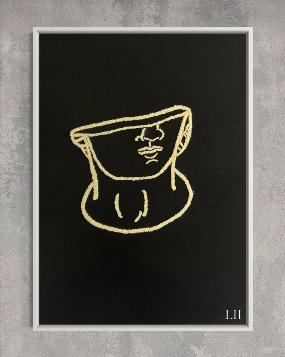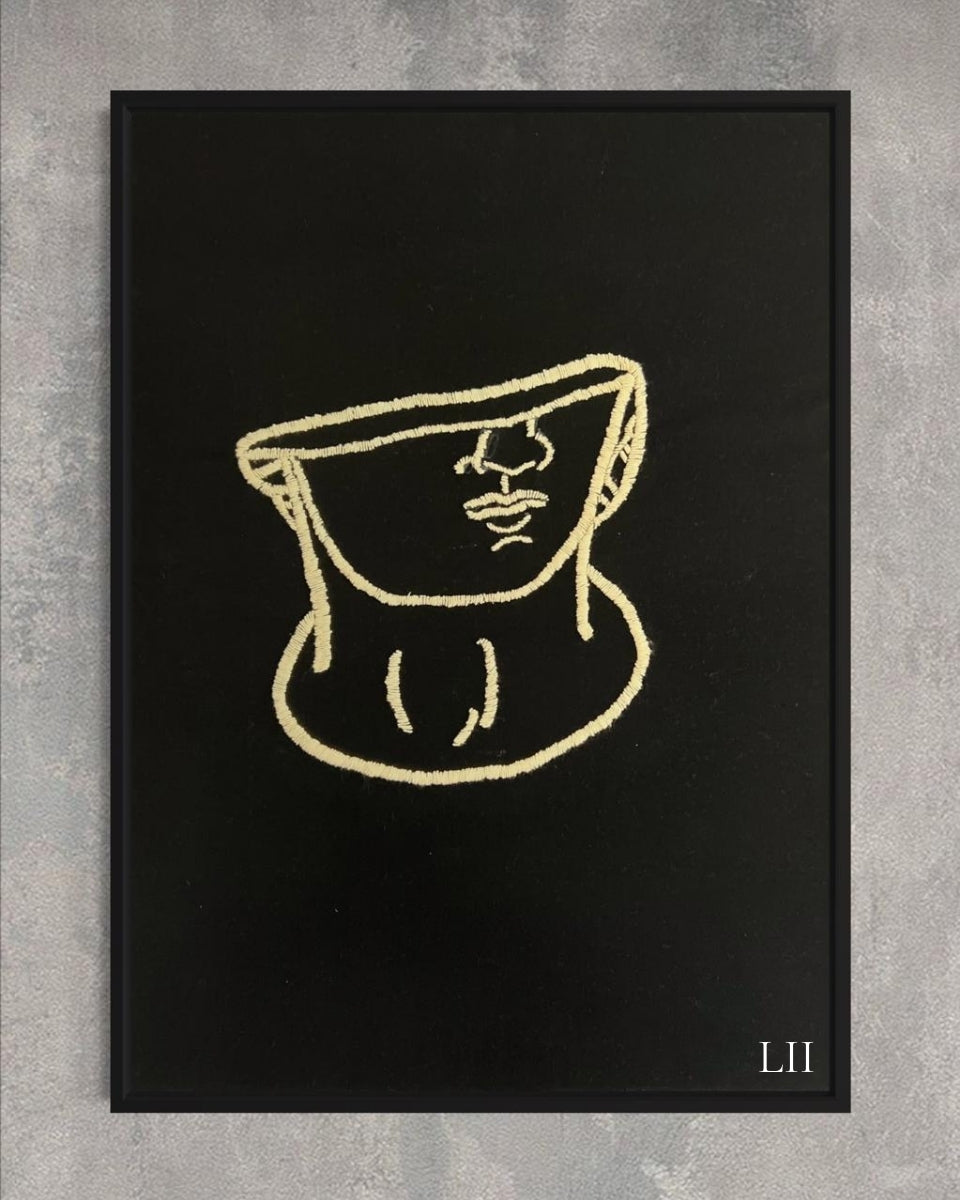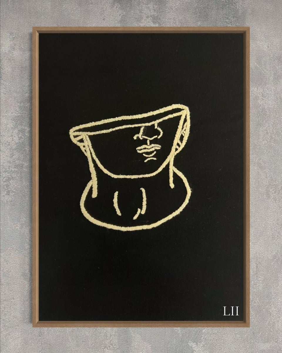 Este cuadro decorativo bordado a mano presenta una figura abstracta inspirada en una escultura griega, delineada en hilos beige sobre fondo negro, creando un contraste elegante y moderno. Su diseño minimalista aporta un toque artístico y sofisticado a cualquier espacio.
